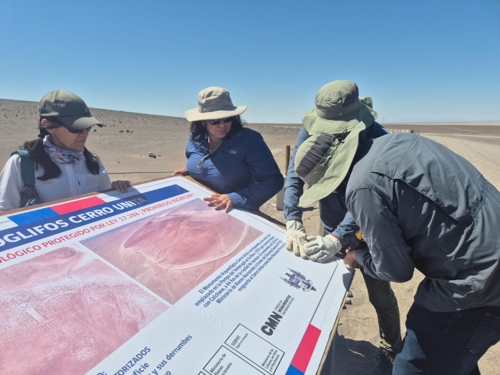 Un equipo de la Seremi de Bienes Nacionales de Tarapacá, encabezado por el seremi Osvaldo Ardiles y acompañado por la encargada de la oficina técnica del Consejo de Monumentos Nacionales, Patricia Henríquez, se trasladaron a la comuna de Huara para renovar la señalética dañada por el sol en el Cerro Unita, donde se ubica el geoglifo Gigante de Tarapacá.