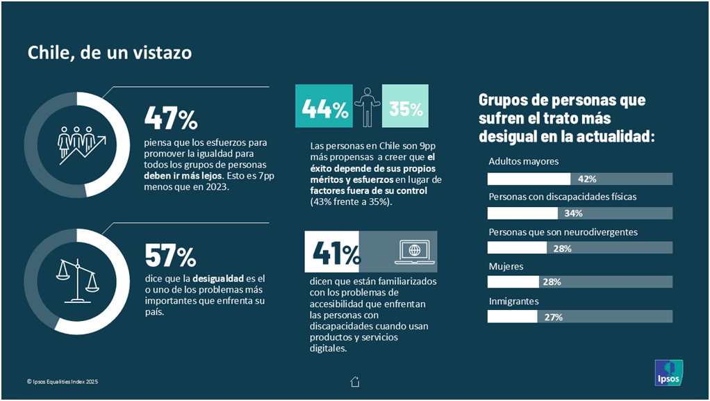Santiago, agosto de 2025. Ipsos, empresa líder en investigación de mercados, dio a conocer los resultados de su estudio internacional “Índice de Igualdad 2025”. En esta tercera edición se recoge la percepción de más de 23 mil personas en 31 países del mundo, incluido Chile, en materias de igualdad, diversidad e inclusión en la sociedad.