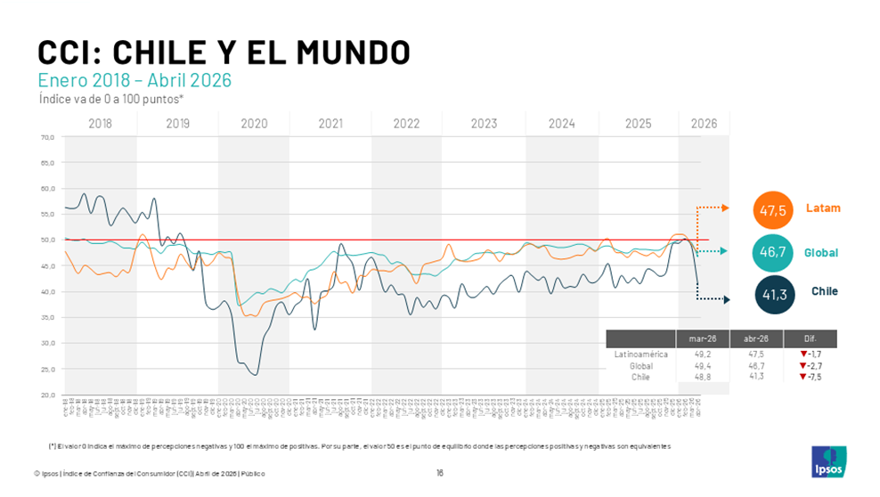 Santiago, abril de 2026. Ipsos dio a conocer los resultados del Índice de Confianza del Consumidor (CCI) de abril, basado en la respuesta de más de 21 mil personas en 30 países, en el que se analiza el nivel de optimismo de los consumidores sobre el estado de la economía local y las finanzas personales.