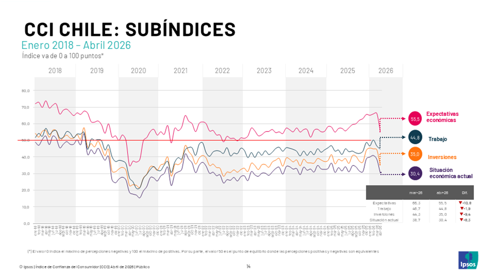 Pese a que el subíndice de Expectativas Económicas es el más alto de Chile (55,5 puntos), registró la caída más estrepitosa, de 10,8 puntos en comparación al mes anterior. La expectativa de una economía local más fuerte para los próximos seis meses bajó 18 puntos porcentuales, al pasar de un 56% hasta el 38%.